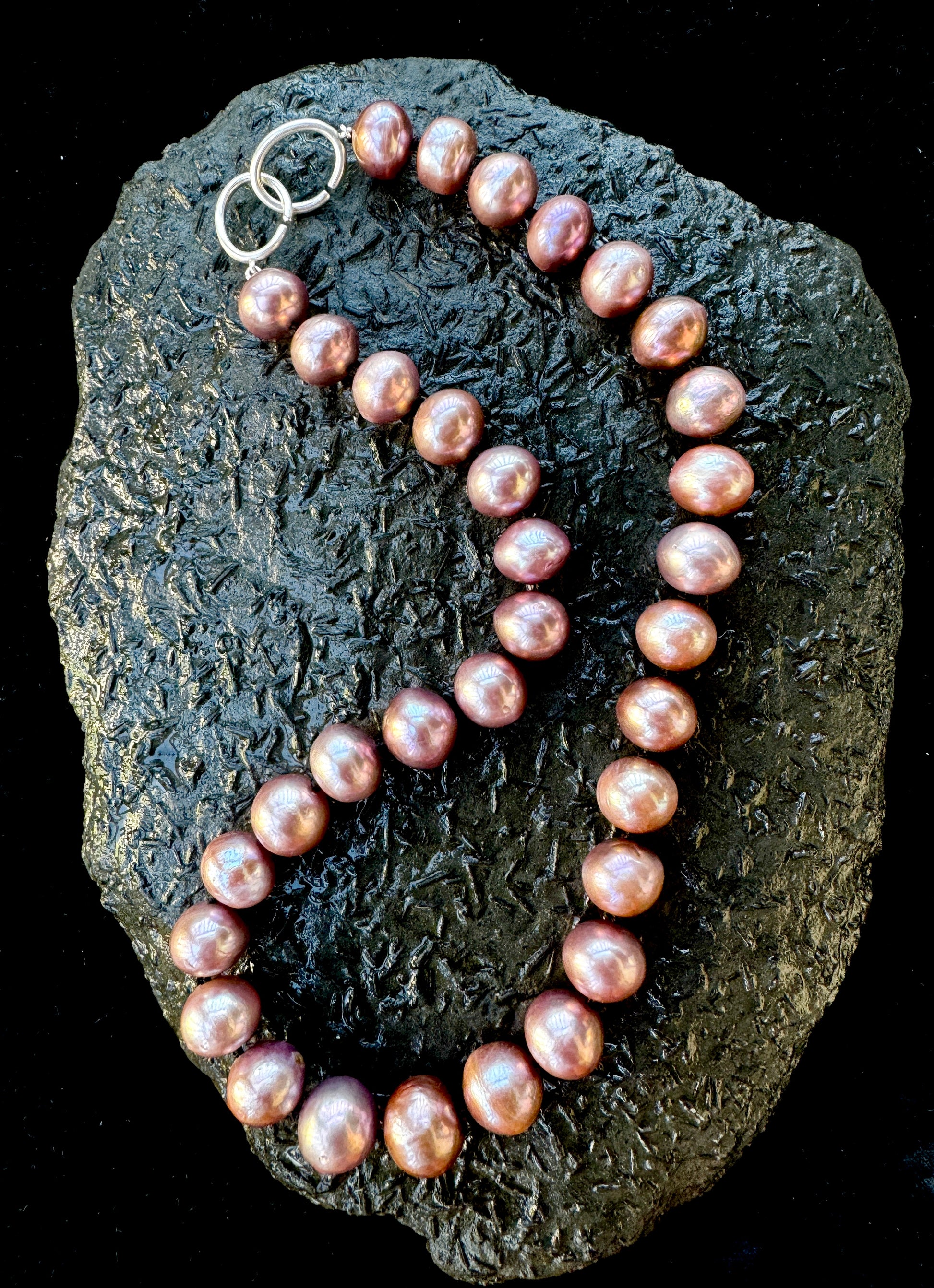 Natural colored pink ovalesque freshwater pearls punctuated with oversized black knots. Signature clasp